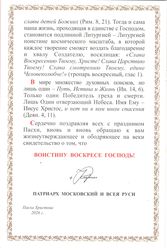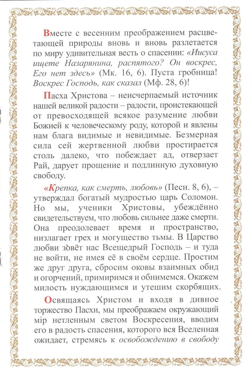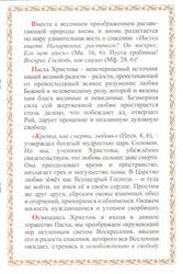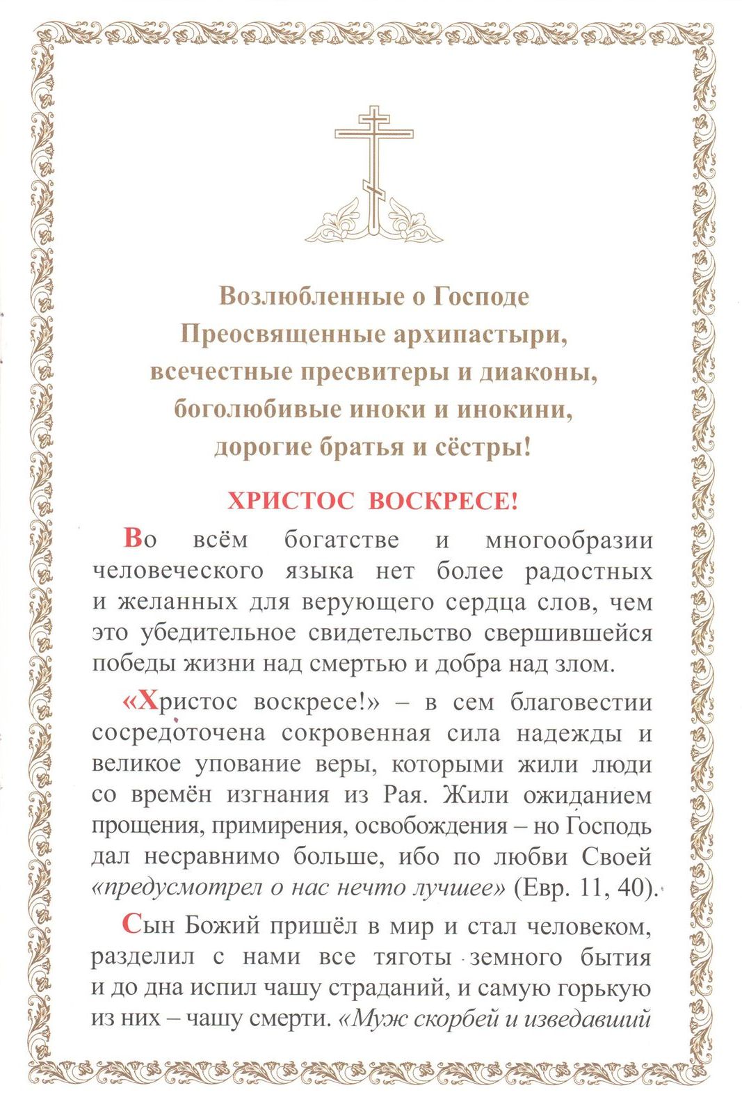Пасха Христова — неисчерпаемый источник нашей великой радости — радости, проистекающей от превосходящей всякое разумение любви Божией к человеческому роду, которой и явлены нам блага видимые и невидимые. Безмерная сила сей жертвенной любви простирается столь далеко, что побеждает ад, отверзает Рай, дарует прощение и подлинную духовную свободу.