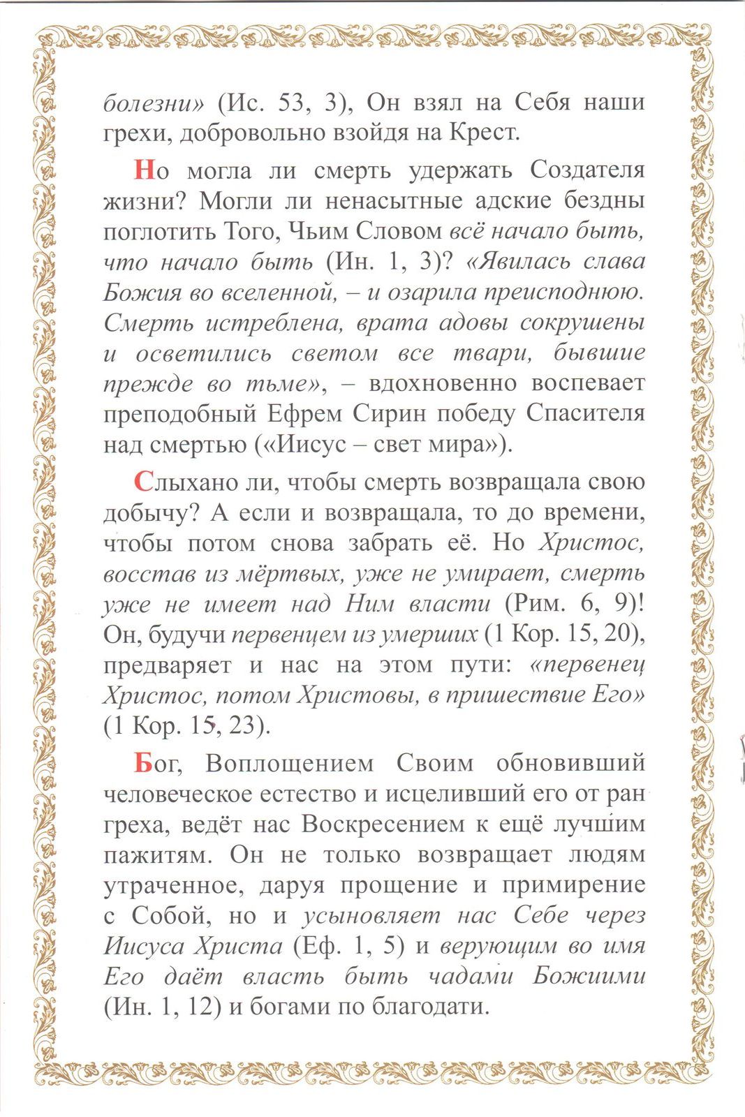 Но могла ли смерть удержать Создателя жизни? Могли ли ненасытные адские бездны поглотить Того, Чьим Словом все начало быть, что начало быть (Ин. 1:3)? «Явилась слава Божия во вселенной, — и озарила преисподнюю. Смерть истреблена, врата адовы сокрушены и осветились светом все твари, бывшие прежде во тьме», — вдохновенно воспевает преподобный Ефрем Сирин победу Спасителя над смертью («Иисус — свет мира»).