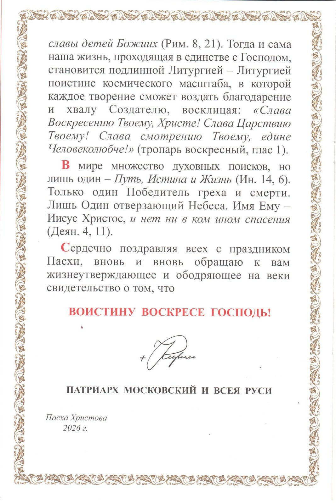Сердечно поздравляя всех с праздником Пасхи, вновь и вновь обращаю к вам жизнеутверждающее и ободряющее на веки свидетельство о том, что