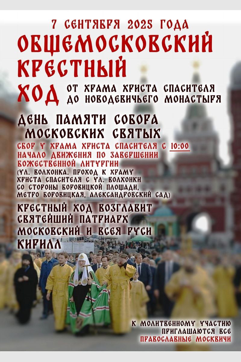 7 сентября, в день празднования Собора Московских святых, по благословению Святейшего Патриарха Московского и всея Руси Кирилла состоится общемосковский крестный ход от кафедрального соборного Храма Христа Спасителя до Новодевичьего ставропигиального женского монастыря.