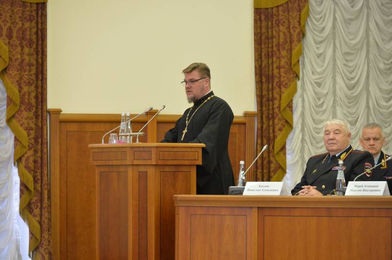 Выступая перед выпускниками настоятель храма Знамения иконы Божией Матери за Петровскими воротами при ГУ МВД России по г. Москве Максим Атаманов подчеркнул: «Вы пришли на службу — это служба нашему Отечеству, нашему первопрестольному городу, правопорядку. Ваше призвание — это не просто профессия, это высокой служение, требующее ответственности и мужества. Вы приняли на себя миссию стоять на страже закона, защищать слабых и бороться со злом».